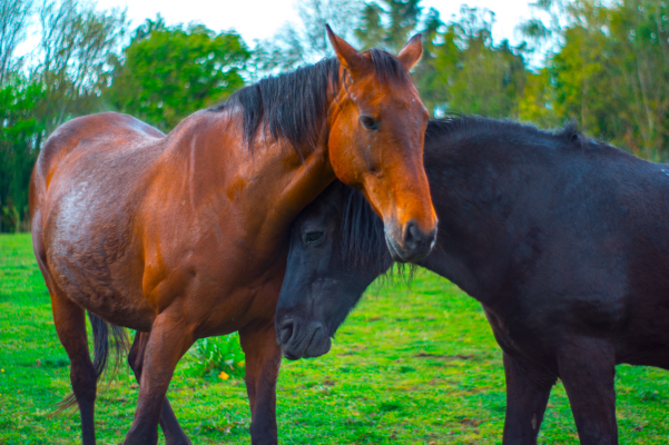In this image I especially like the way the background curves around. This effect happened because I was using a vintage film lens. The colours in this photograph are bright and alive. The image is composed so that your attention is drawn to the centre of the image. There are three curves at the foot of the picture which pull the picture together. There is a small curve under the brown horses legs, the larger curve under the black horses chin, and then a corresponding smaller curve again on the other side. These have the effect of drawing your eye to the top of the larger curve, which is where the two horses are rubbing heads.